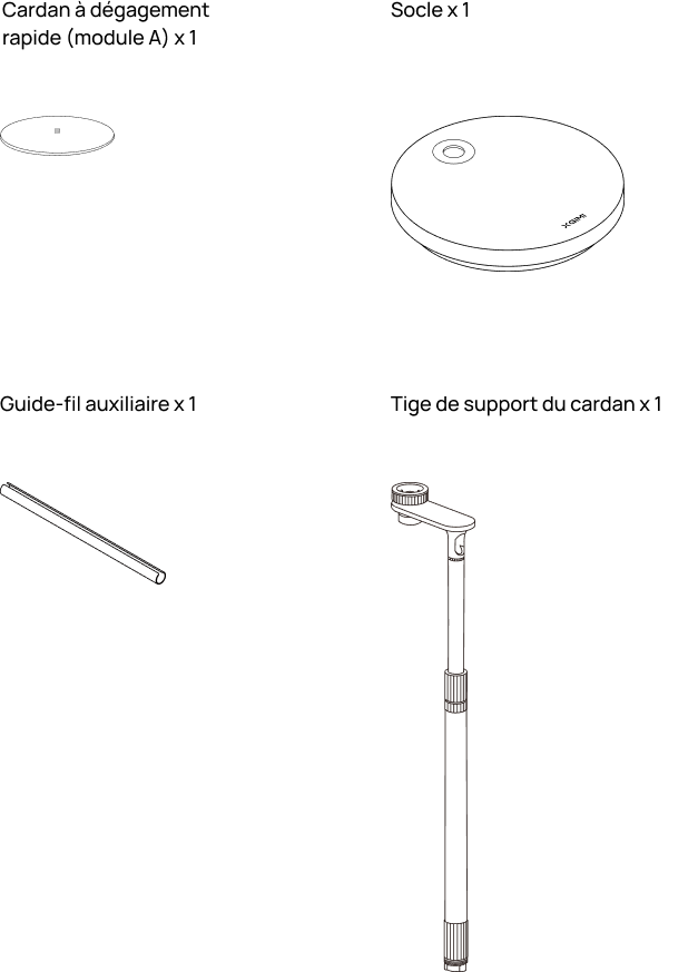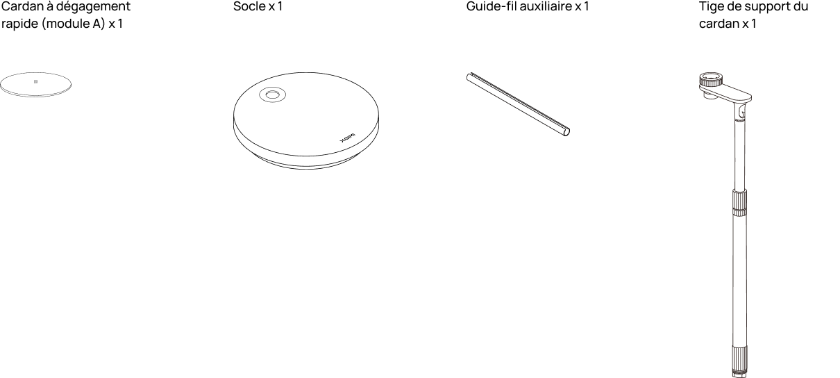 Socle x 1, tige de support de cardan x 1, cardan à fixation rapide x 1, guide-fil auxiliaire x 1, manuel x 1