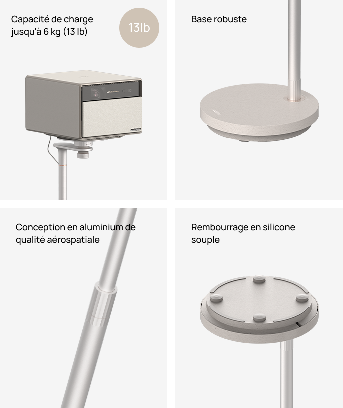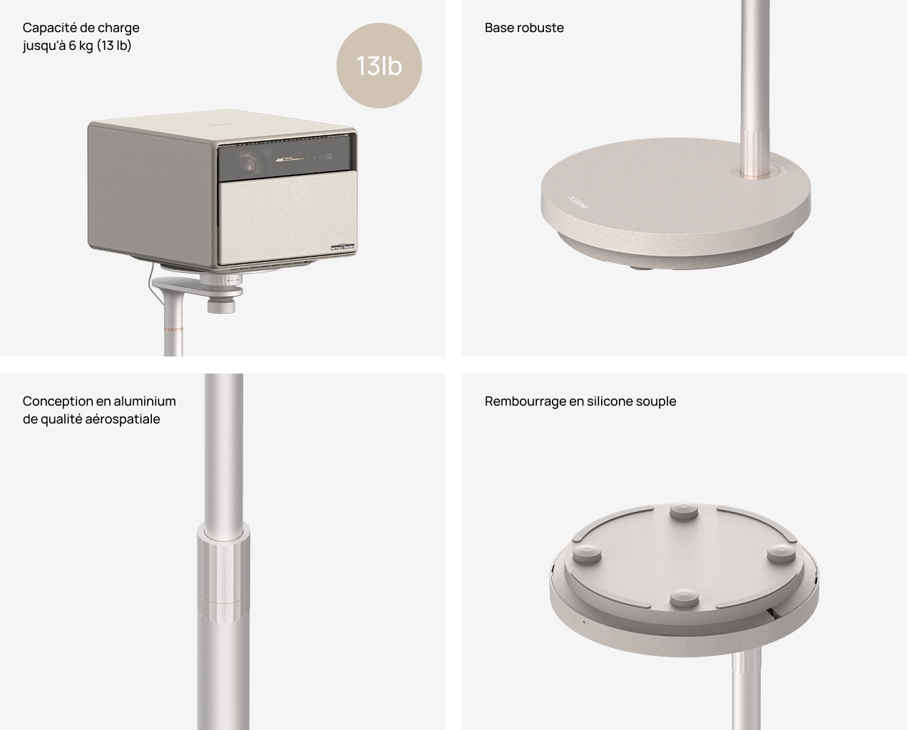 • Robuste et Durable : Supporte des appareils pesant jusqu'à 6 kg (13 livres). La construction en aluminium de qualité aérospatiale avec une base solide assure une stabilité exceptionnelle et une durabilité à long terme.