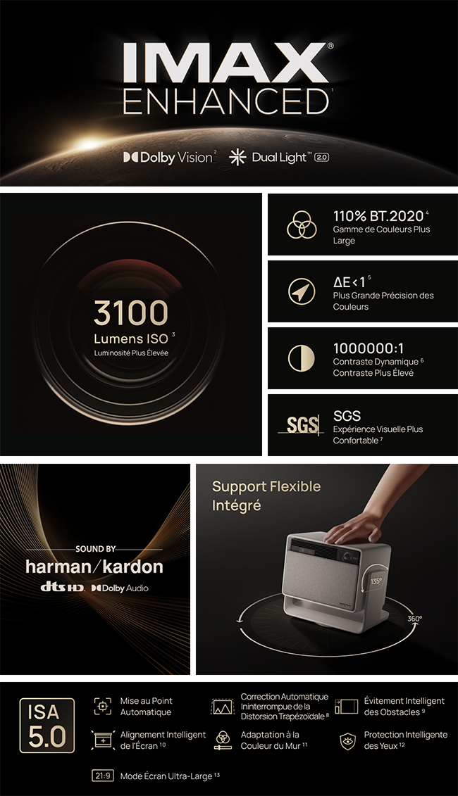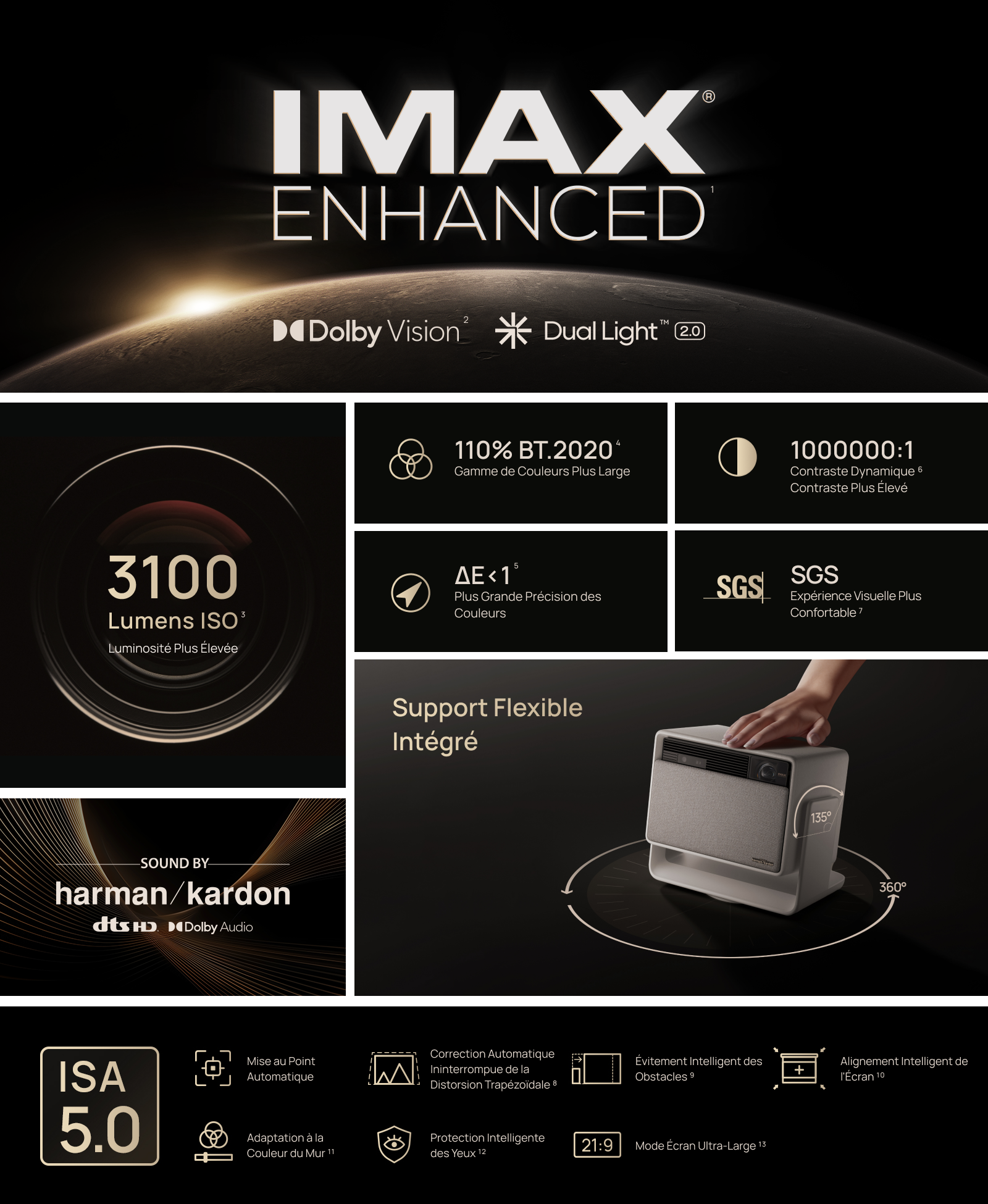 - Certifié IMAX Enhanced et Dolby Vision : IMAX Enhanced permet aux utilisateurs de vivre une véritable expérience cinématographique IMAX sur grand écran. Dolby Vision ajoute des effets saisissants pour rendre votre visionnage encore plus immersif.