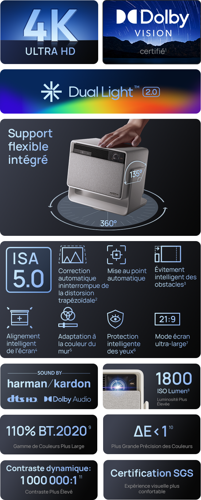- Dual Light 2.0 : La technologie avancée pour une luminosité optimale. Bénéficiez de 1800 lumens ISO pour des couleurs précises et une qualité d'image exceptionnelle. Que ce soit de jour ou de nuit, profitez d'un écran toujours clair et lumineux, où que vous soyez.